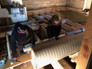 Tuulensuojalevelyjen jälkeen koko rakenne, etenkin reunat ja nurkat, paperoitiin huolellisesti tervapaperilla. Paperi nostettin reilusti myös seinille vedon estämiseksi lattian rajasta. Paperoinnin jälkeen oli vuorossa eristäminen. Tällä kertaa ei lähdetty edes harkitsemaan eristelevyhommia, vaan toteutettiin eristäminen ekovillan puhallusvillalla. Puhallusvillakoneen saa lainaan useimmista rautakaupoista villan ostamisen yhteydessä. Villoittaminen oli päivän homma kahdelta henkilöltä. Kone haettiin aamulla ja seitsemään mennessä se oli jo palautettu takaisin. Lattia täytettiin villalla reilusti yli, jonka jälkeen se tampattiin kevyesti sekä käytiin vielä kädellä läpi kaikki nurkat ja reunat, jotta villa saatiin mahdollisimman tiiviisti paikoilleen. Tämän jälkeen vielä toinen kerta villaa ja toinen tamppaus ja valmista tuli. Kahden hengen miehityksellä onnistui oikein hyvin. Toinen lapoi villaa koneeseen ja toinen puhalsi villaa letkun päässä lattiaan.
